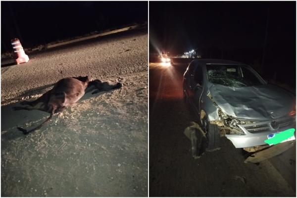 Carro colide com vaca solta na pista na BR-122, em Guanambi.